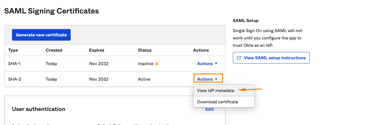 - On the Sign On tab, locate the SAML Signing Certificates section. Next to SHA-2, select Actions > View IdP metadata and copy the IdP metadata link address—you will need this to configure SSO in DataRobot.