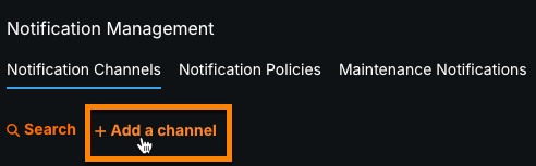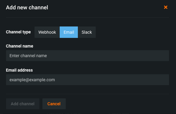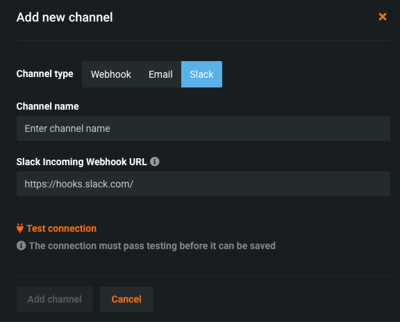 Navigate to the Notification Channels tab and click Add a channel. Before proceeding, select the channel type: webhook, email, or Slack. Then, fill out the corresponding fields.