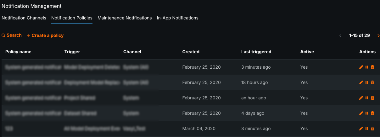 Policies can be enabled or disabled at any time, allowing you to prevent notification fatigue, or bring attention to additional events. Locate the policy in the Notification Policies tab. Select the play icon to enable a policy and the pause icon to disable it.