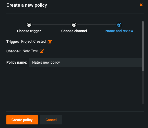 Review the selected trigger and channel for the policy you are creating. If you want to go back and edit either of the selections, click the edit icon (