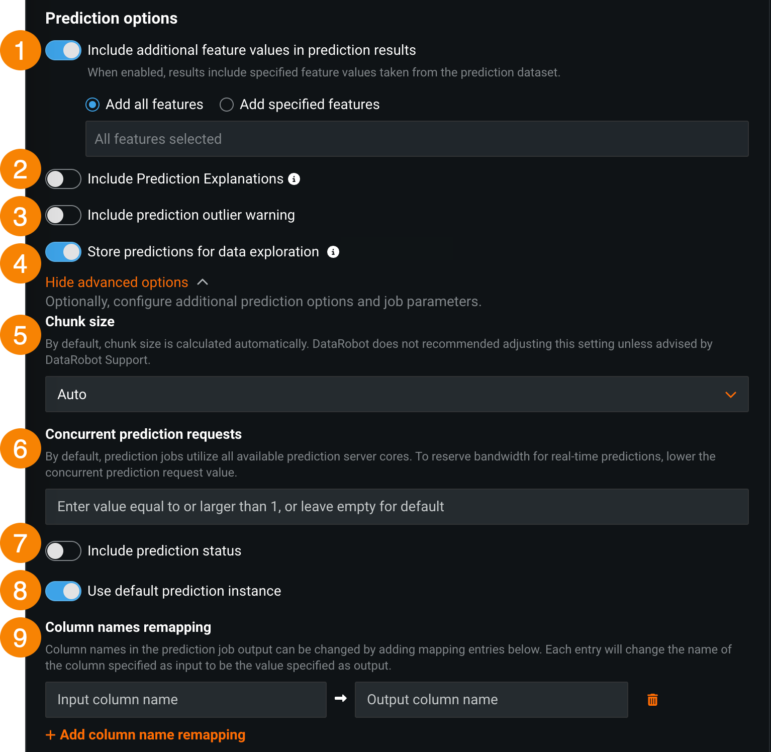 | 2 | Include Prediction Explanations | Adds columns for Prediction Explanations to your prediction output.