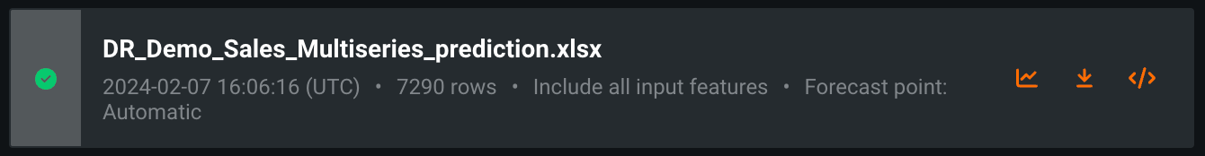 After you configure predictions settings and click Compute and download predictions to score the data, wait for the prediction job to complete. You can perform the following actions on completed prediction jobs: