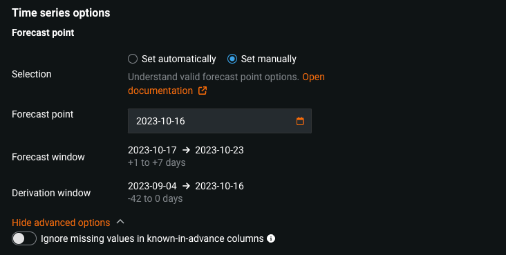 Set automatically: DataRobot sets the forecast point for you based on the scoring data, generally the latest possible date timestamp that is a valid forecast point.