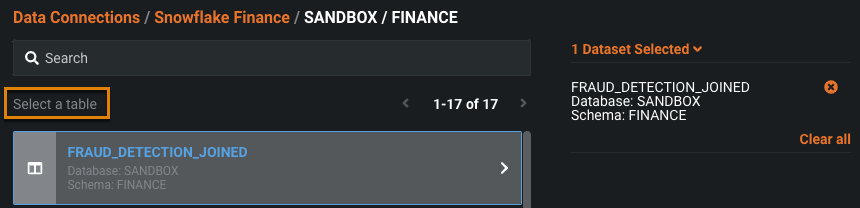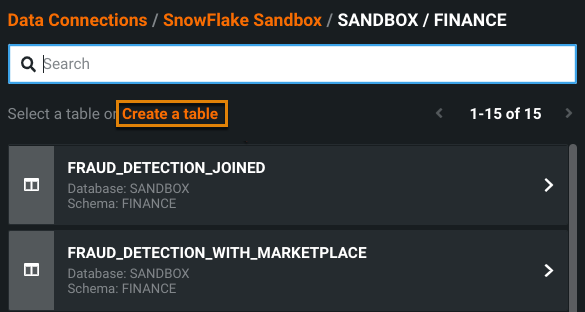 Select a table or create a new table. If you create a new table, DataRobot creates the table with the proper features, and assigns the correct data type to each feature.