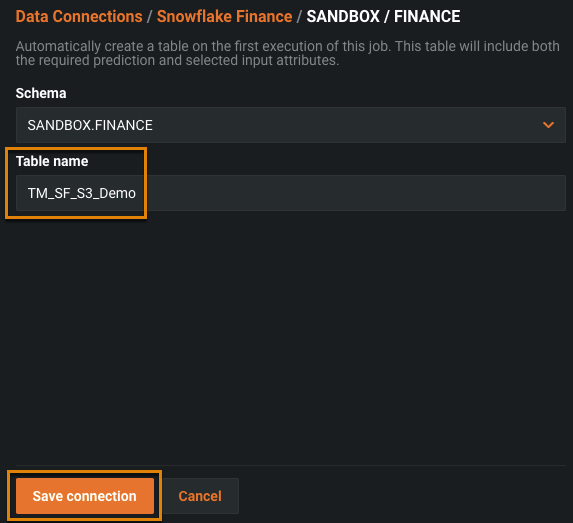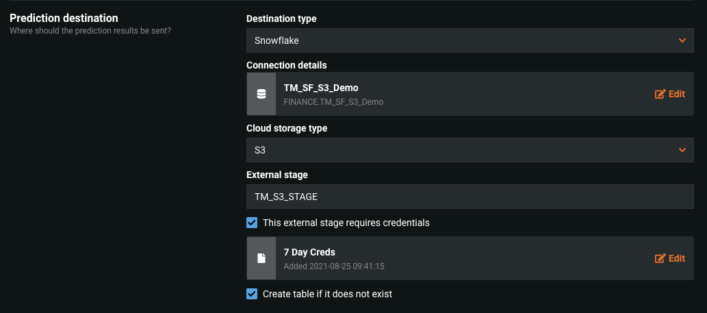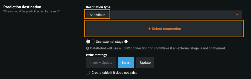 For Prediction destination, select Snowflake as the Destination type and click + Select connection.