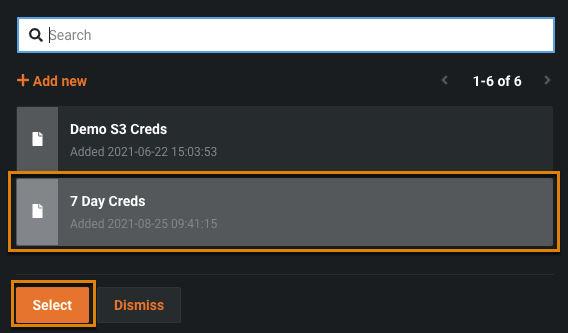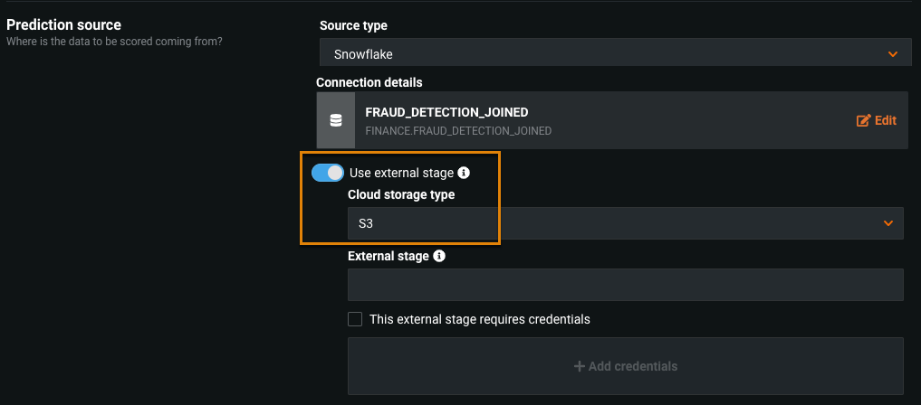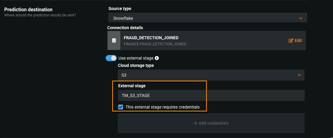 Enter the External stage you created for your Snowflake account. Enable This external stage requires credentials and click + Add credentials.