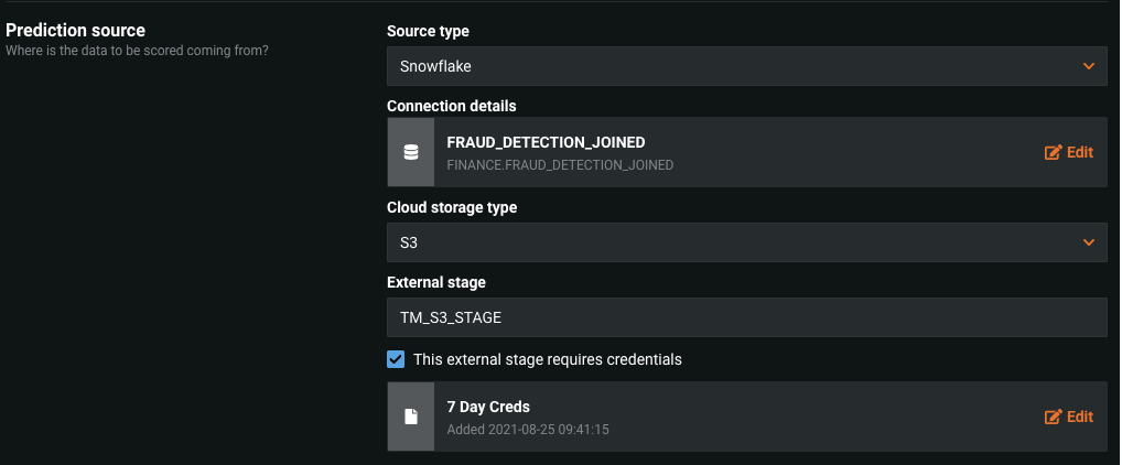 To complete these examples, follow the steps in Create a prediction job definition, using the following procedures to configure Snowflake as your prediction source and destination.