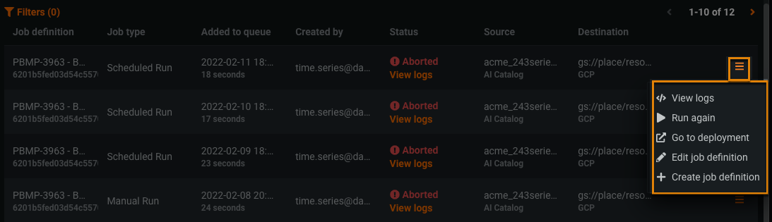 | Job source | Specifies the action that initiated the job—Make Predictions, Scheduled Run, Manual Run, Integration, Ad hoc API, Insights, Portable, and Challengers. |