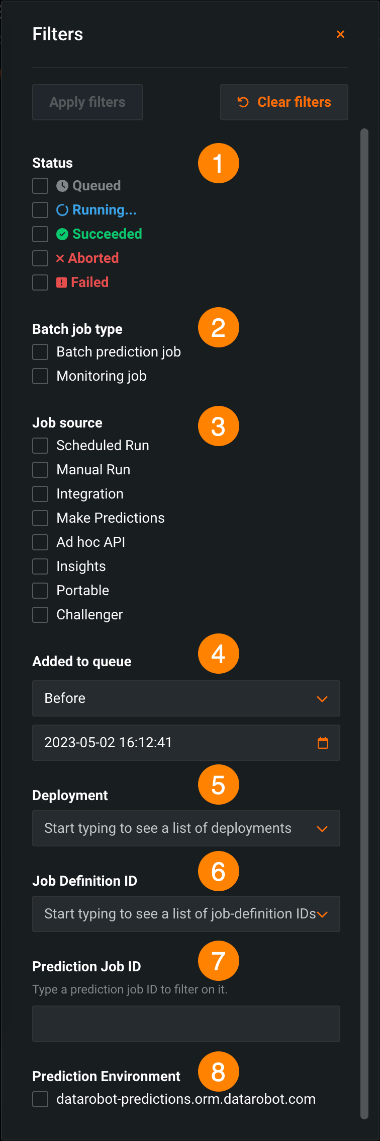4 Added to queue Filter by a time range: Before or After a date you select. 5 Deployment Select a deployment to filter by. Start typing and select a deployment from the dropdown list. 6 Job Definition ID Filter by the jobs generated from a specific job definition. Start typing and select a job definition ID from the dropdown list. 7 Prediction Job ID Enter a specific prediction job ID. 8 Prediction Environment Select from your configured prediction environments.