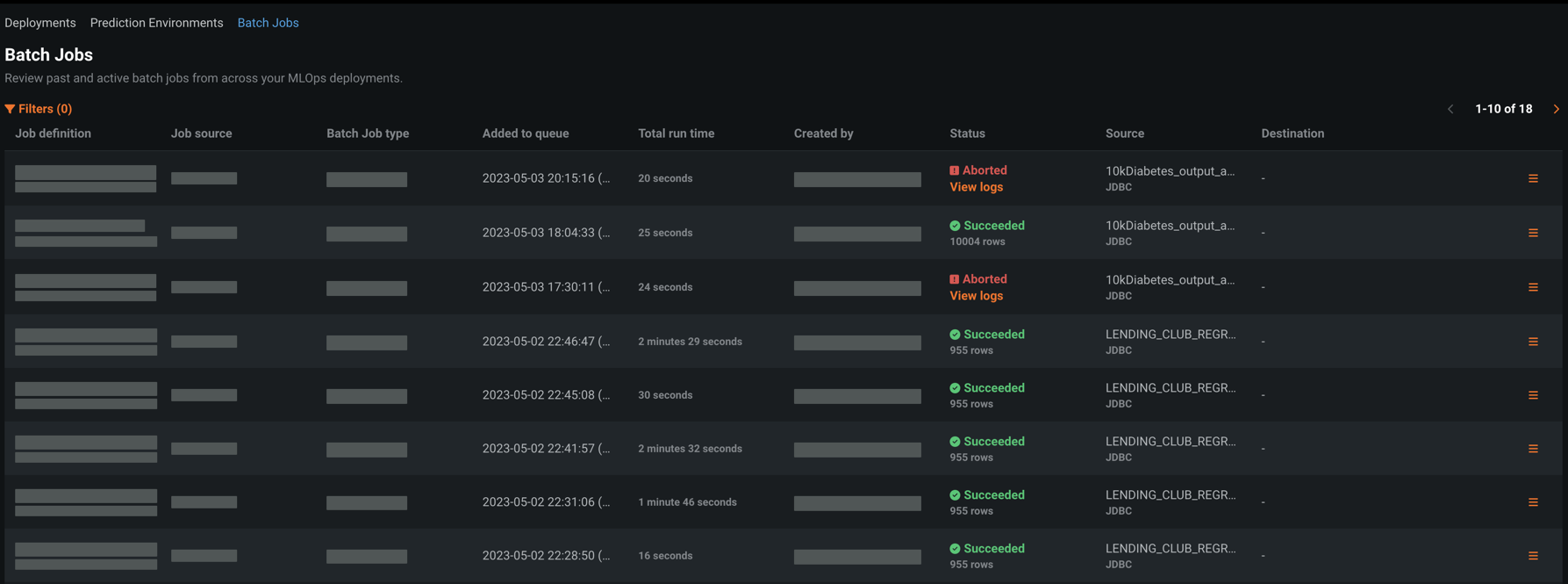 To access batch jobs, navigate to Deployments > Batch Jobs. You can view and manage all running or complete jobs. Any prediction or monitoring jobs created for deployments appear on this page. In addition, you can filter jobs by status, type, start and end time, deployment, job definition ID, job ID, and prediction environment.