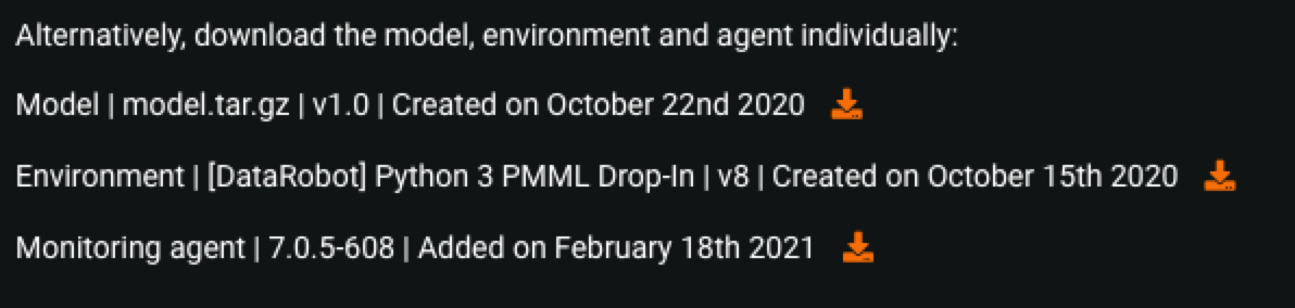 Alternatively, instead of downloading the contents in one bundle, you can download the custom model, custom environment, or the monitoring agent as individual components.