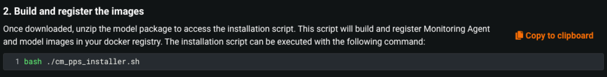 Next, access the installation script (unzipped from the bundle) to build the custom model PPS with monitoring agent support. To do so, run the command displayed in step 2: