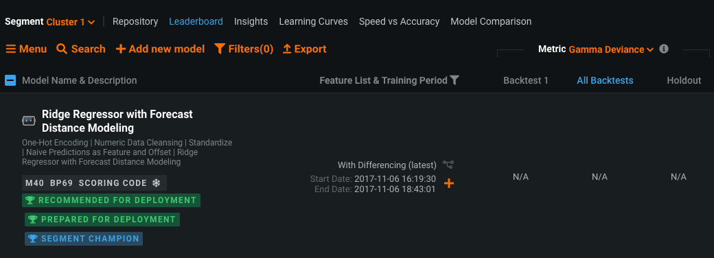 If the champion model for a segment does not have Scoring Code, select a model that does have Scoring Code: