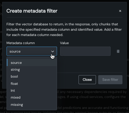 A vector databases data source can now contain up to 50 additional metadata columns, in addition to the required document and document_file_path columns. This additional metadata can be used as the basis for filtering when chatting with an LLM. By adding metadata to chunks in the vector database, the model can more effectively search the vector database for these chunks during retrieval.