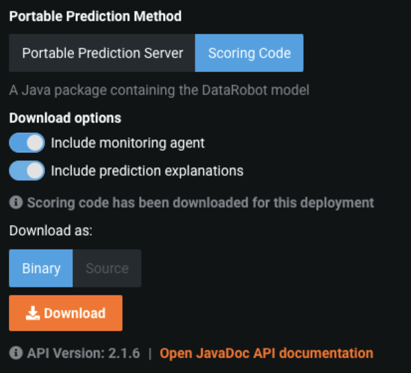 Users who built models in AutoML can download Scoring Code for the model via the model Leaderboard without engaging in the deployment workflow. Previously, downloading Scoring Code made the associated deployment a permanent fixture. Now, these deployments can be deactivated or deleted. Additionally, users can choose to include prediction explanations with their Scoring Code download.