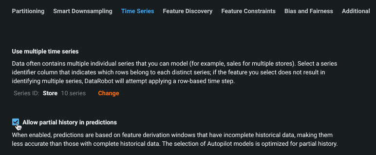 "Cold start" is the ability to model on series that were not seen in the training data; partial history refers to predictions datasets with series history that is only partially known (historical rows are partially available within the feature derivation window). While some blueprints are designed to predict on new series given some history, others are not. This can lead to suboptimal predictions and so DataRobot would error when making predictions for a series for which the full history was not provided. (The full history was needed to derive the features for specific forecast points.) With this release, time series introduces blueprints optimized for cold start and also for partial history modeling. The new blueprints are run as part of Autopilot and are available for multiseries regression projects.