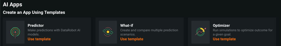 The AI App Builder, available from the Applications tab, provides a no-code platform to enable core DataRobot services (making predictions, optimizing outcomes, simulating scenarios, and more) without having to build models and evaluate their performance in DataRobot.