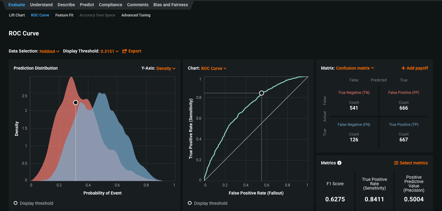 The ROC Curve tab has been redesigned to streamline the model evaluation strategies you can perform. Along with the Prediction Distribution graph, ROC curve, confusion matrix, and a summary of metrics, you can now generate profit curves, precision-recall curves, and custom charts in the ROC Curve tab.