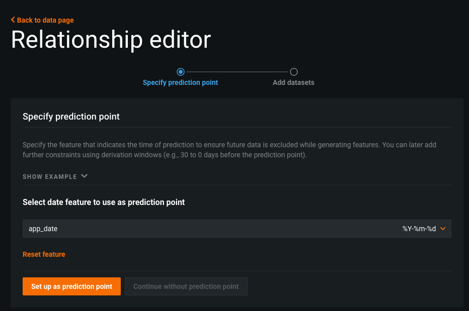 The Relationship Editor setup guide is a new intermediate screen that displays when you click the Add datasets button on the EDA (Data) page. It walks you through the process of specifying prediction points for time-aware features and adding the datasets to be joined for Feature Discovery. For details, see Create a Feature Discovery project.