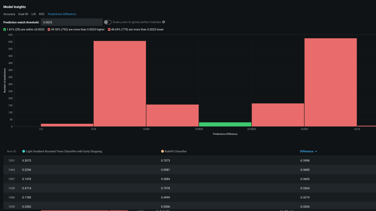The Prediction Difference tab lets you compare predictions of the models on a row-by-row basis: