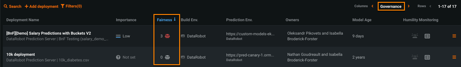 The Fairness tab for individual models provides two interactive and exportable charts—Per-Class Bias and Fairness Over Time—helping you understand why a deployment is failing fairness tests and which features are below the predefined fairness threshold.