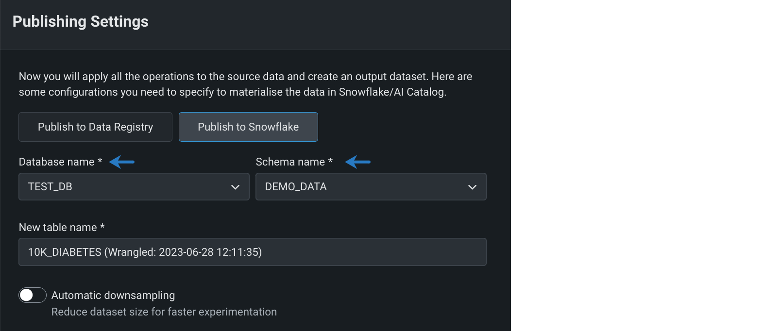 You can now publish wrangling recipes to materialize data in DataRobot’s Data Registry or Snowflake. When you publish a wrangling recipe, operations are pushed down into Snowflake virtual warehouse, allowing you to leverage the security, compliance, and financial controls of Snowflake. By default, the output dataset is materialized in DataRobot's Data Registry. Now when you can materialize the wrangled dataset in Snowflake databases and schemas for which you have write access.