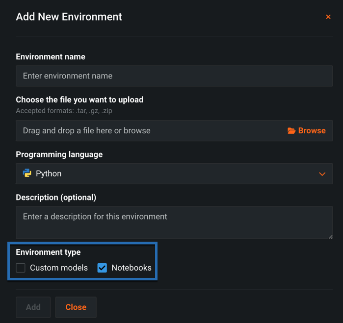 Now available for preview, DataRobot Notebooks is integrated with DataRobot custom environments, allowing you to define reusable custom Docker images for running notebook sessions. You can create a custom environment to use for your notebook sessions if you want full control over the environment, and to leverage reproducible dependencies beyond those available in the built-in images.