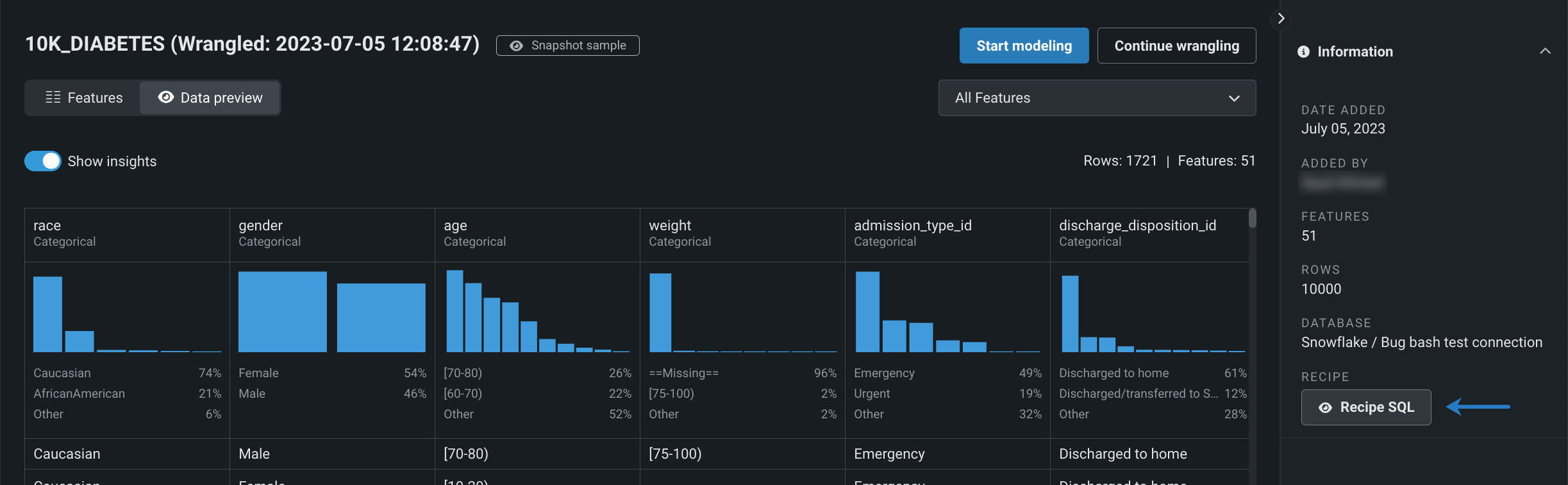 Additionally, for wrangled datasets added to a Use Case, you can now view the SQL recipe used to generate the output.