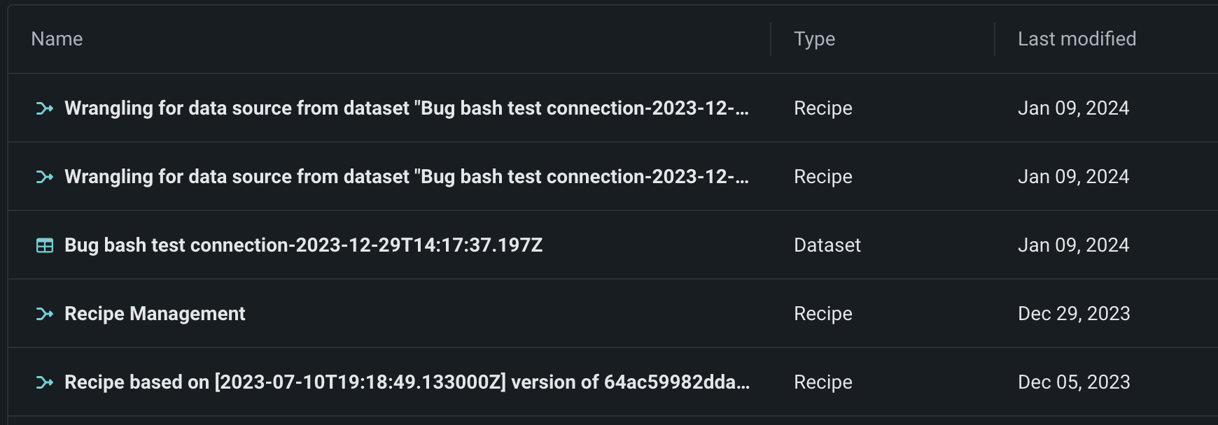New icons have been added to the Data tab to quickly distinguish between datasets and recipes.