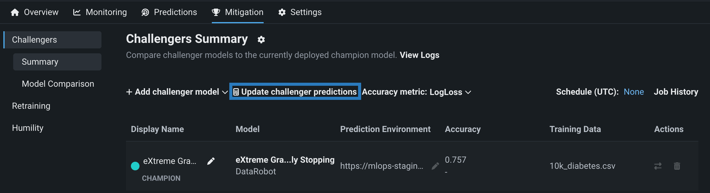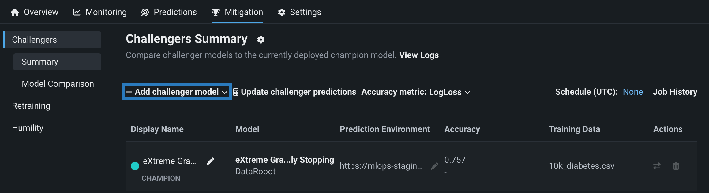 During model development, models are often compared to one another until one is chosen to be deployed into a production environment. The Mitigation > Challengers tab provides a way to continue model comparison post-deployment. You can submit challenger models that shadow a deployed model and replay predictions made against the deployed model. This allows you to compare the predictions made by the challenger models to the currently deployed model (the "champion") to determine if there is a superior model that would be a better fit.