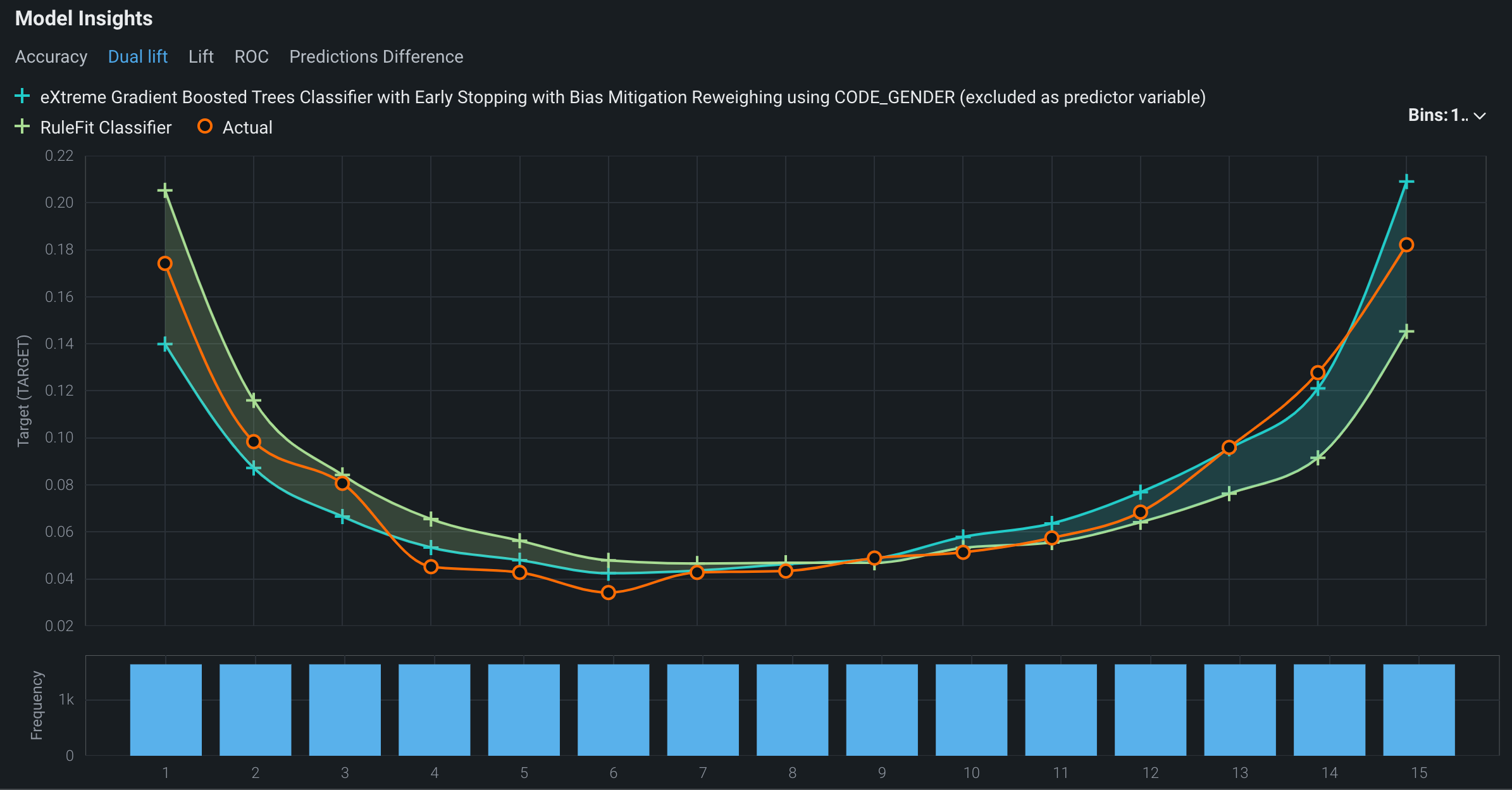 A dual lift chart is a visualization comparing two selected models against each other. This visualization can reveal how models underpredict or overpredict the actual values across the distribution of their predictions. The prediction data is evenly distributed into equal size bins in increasing order.
