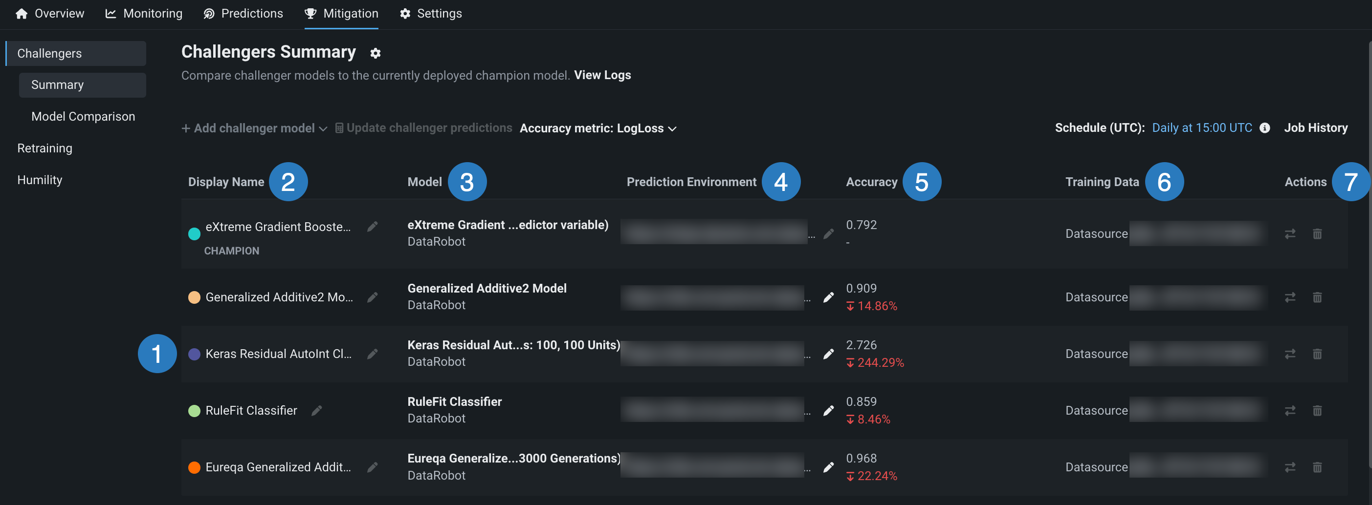 | 2 | Display Name | The display name for each model. Use the pencil icon to edit the display name. This field is useful for describing the purpose or strategy of each challenger (e.g., "reference model," "former champion," "reduced feature list"). |