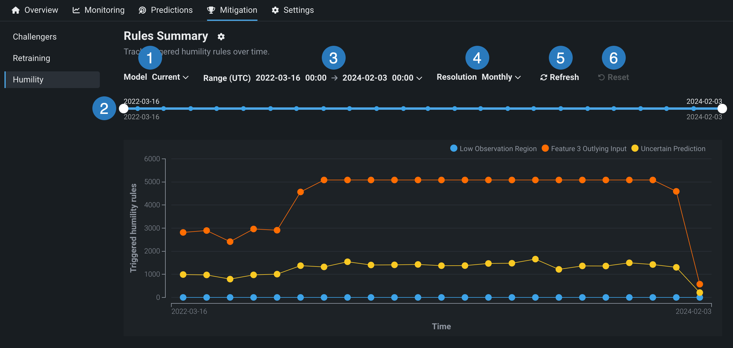 After configuring humility rules on the Settings > Humility tab and making predictions with humility monitoring enabled, you can view the humility data collected over time for a deployment from the Monitoring > Humility tab. The X-axis measures the range of time that predictions have been made for the deployment. The Y-axis measures the number of times humility rules triggered in the given period.