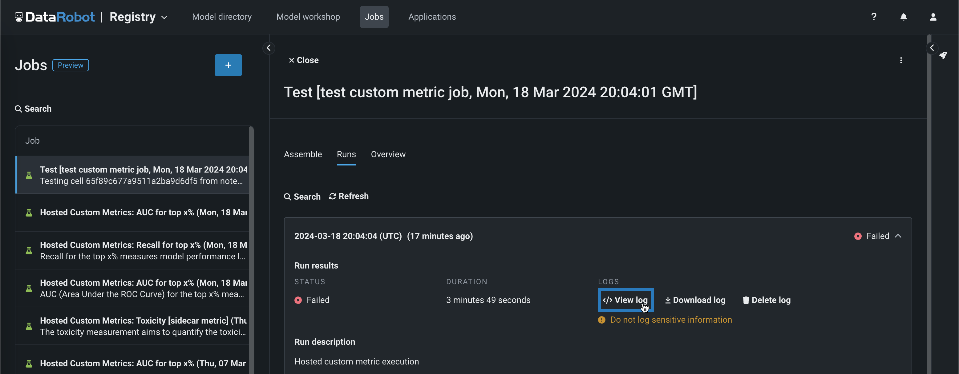 To troubleshoot a custom metric's code, navigate to the job's Runs tab, containing a log of the failed test. In the failed run, click View log.