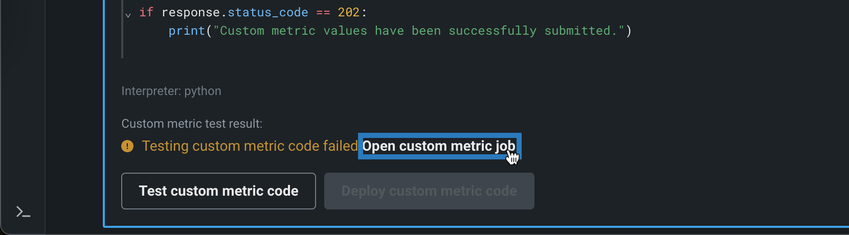 If the code does not run properly, you will receive the Testing custom metric code failed warning after testing completes. Click Open custom metric job to access the job and check the logs to troubleshoot the issue:
