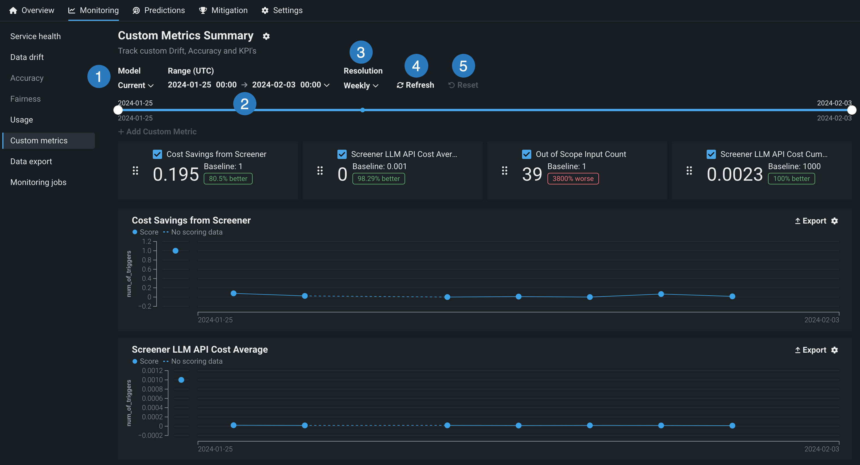 | 1 | Model | Select the deployment's model, current or previous, to show custom metrics for. |