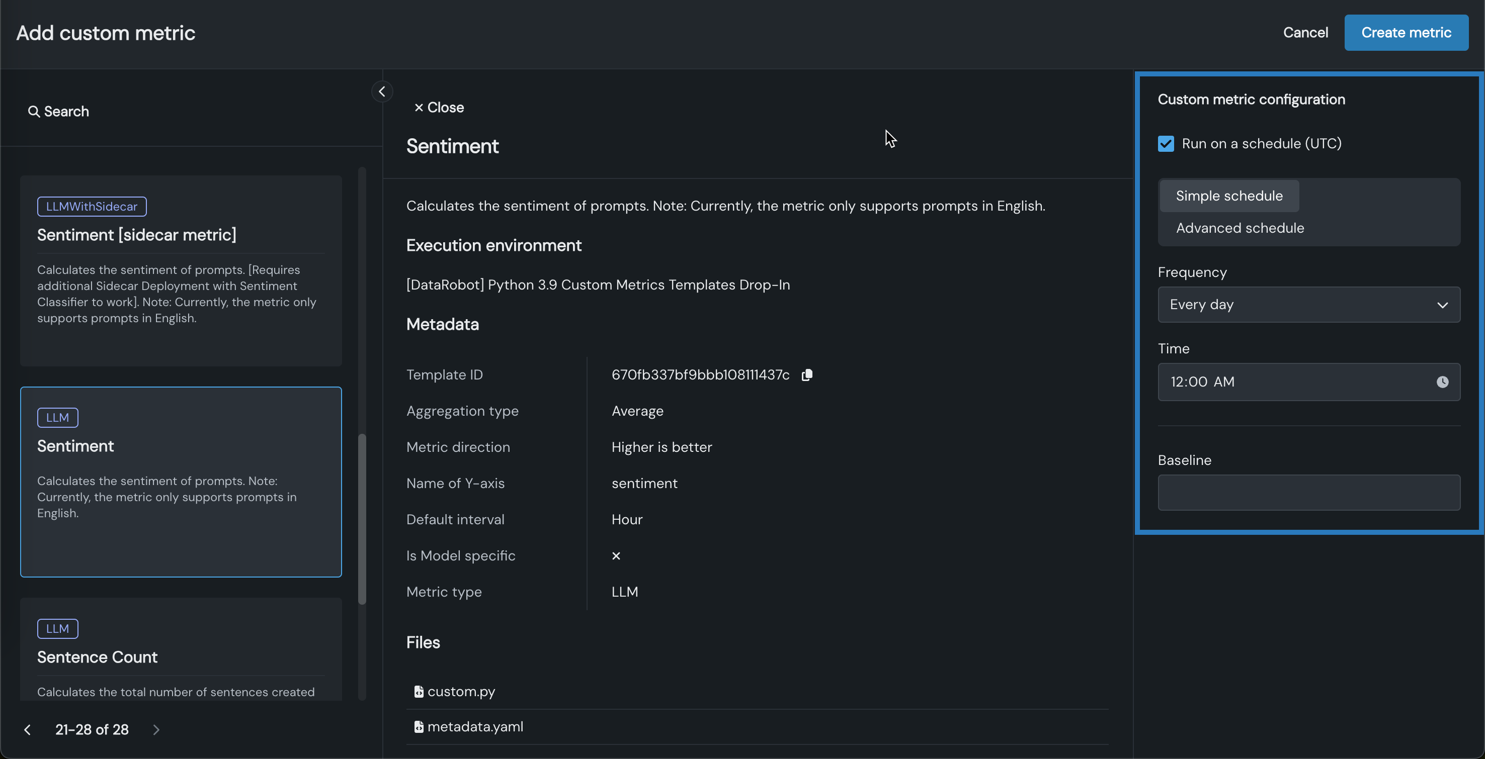 After you select a metric from the list, in the Custom metric configuration sidebar, configure a metric calculation schedule or run the metric calculation immediately, and, optionally, set a metric baseline value.