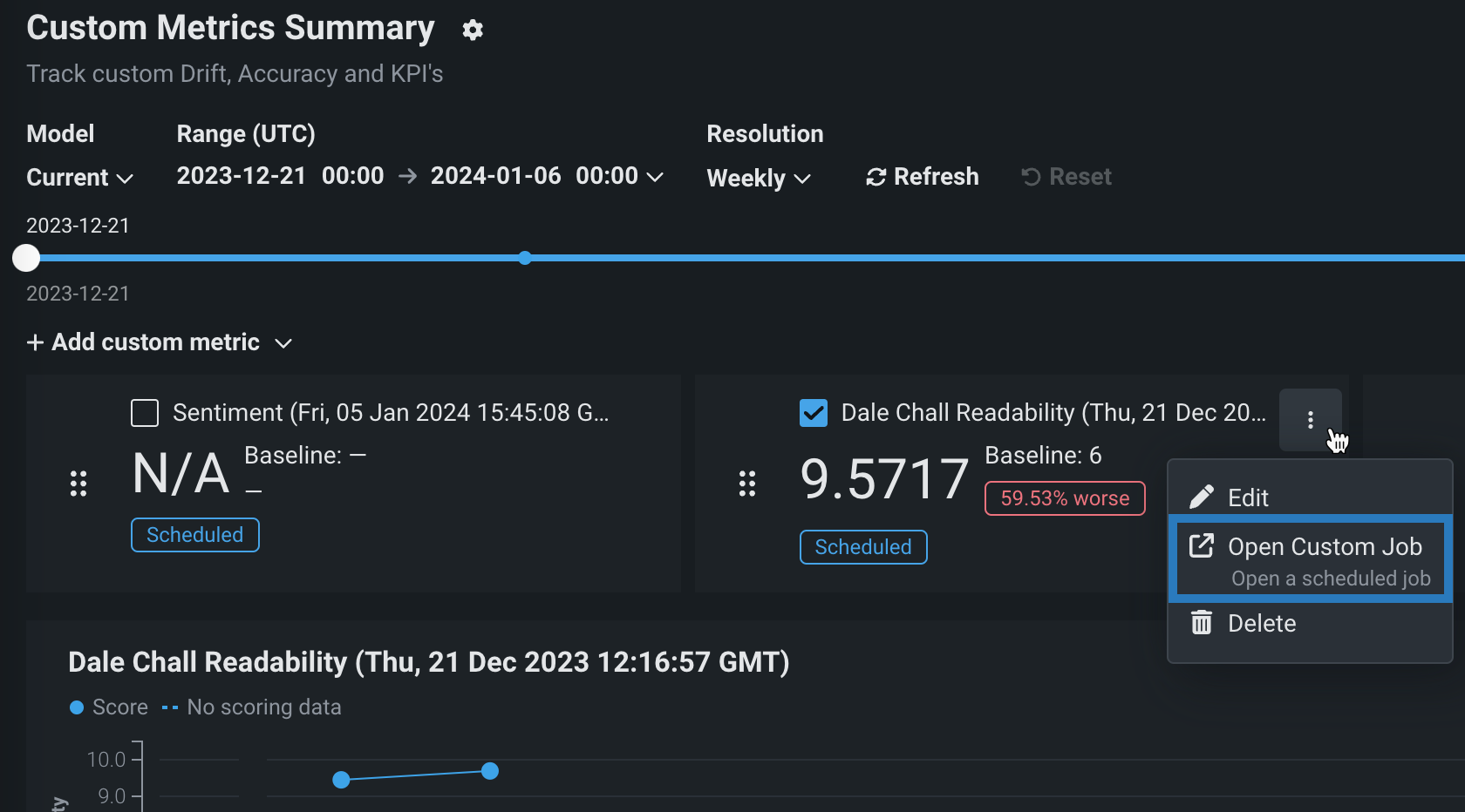 After you create a custom metric, you can view the custom job associated with the metric. This job runs on the metric's defined schedule, in the same way as hosted custom metrics (those not from the gallery). To access and manage the associated custom job, click the Actions menu and then click Open Custom Job: