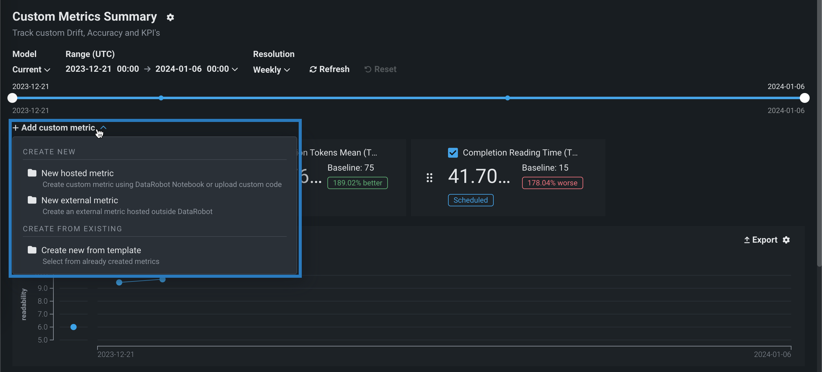 | New external metric | Add a custom metric where the calculations of the metric are not directly hosted by DataRobot. An external metric is a simple API used to submit a metric value for DataRobot to save and visualize. The metric calculation is handled externally, by the user. External metrics can be combined with other tools in DataRobot like notebooks, jobs, or custom models, or external tools like Airflow or cloud providers to provide the hosting and calculation needed for a particular metric. External custom metrics provide a simple option to save a value from your AI solution for tracking and visualization in DataRobot. For example, you could track the change in LLM cost, calculated by your LLM provider, over time. |
