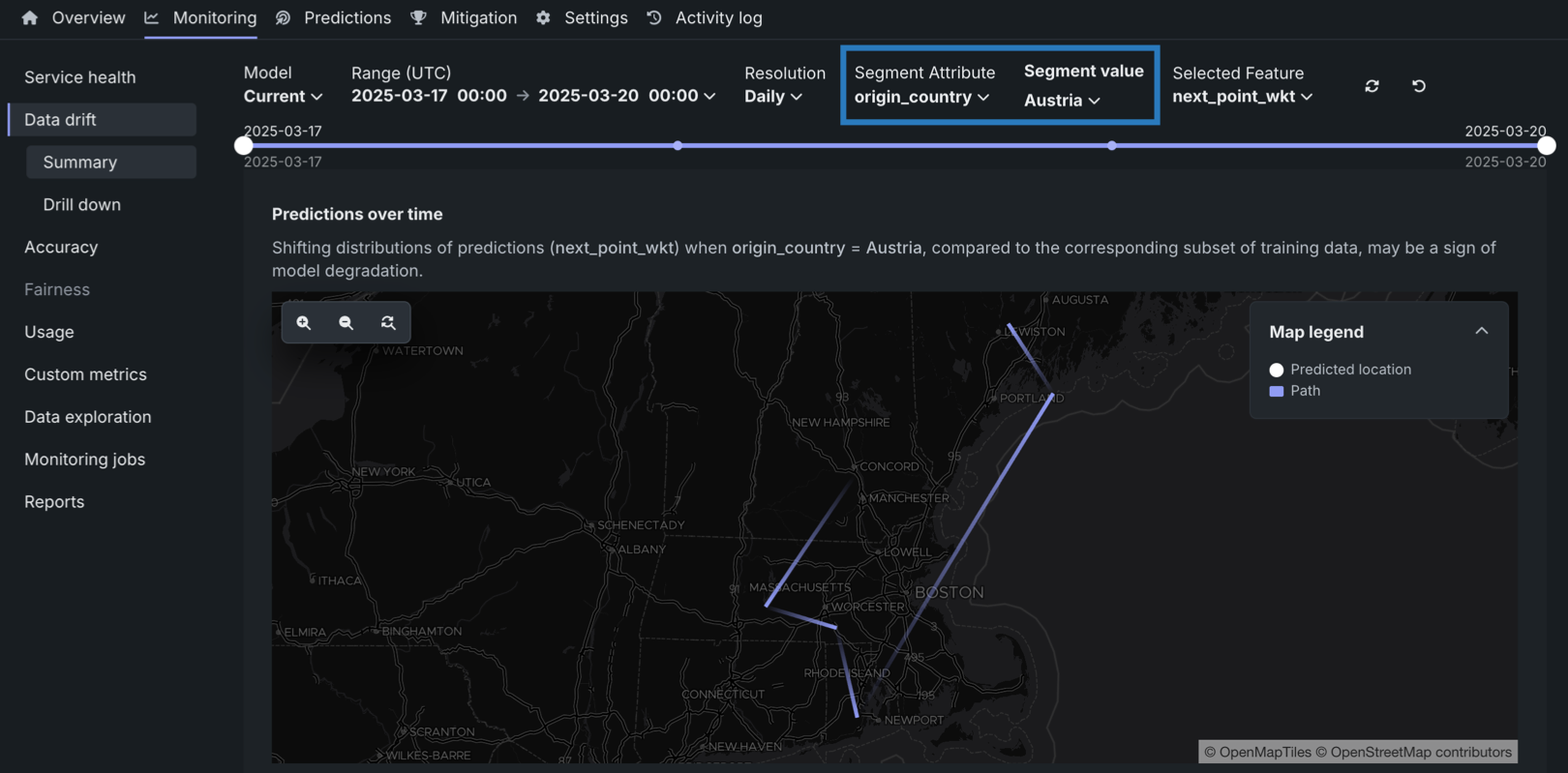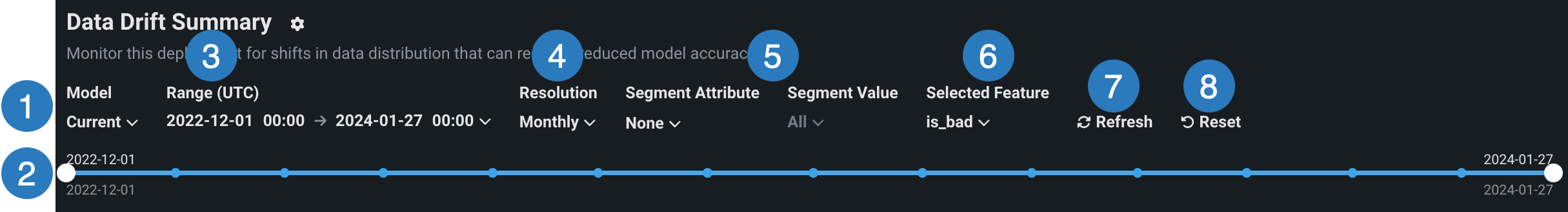 | 5 | Segment Attribute / Segment Value | Sets the individual attribute and value to filter the data drift visualizations for segment analysis. |