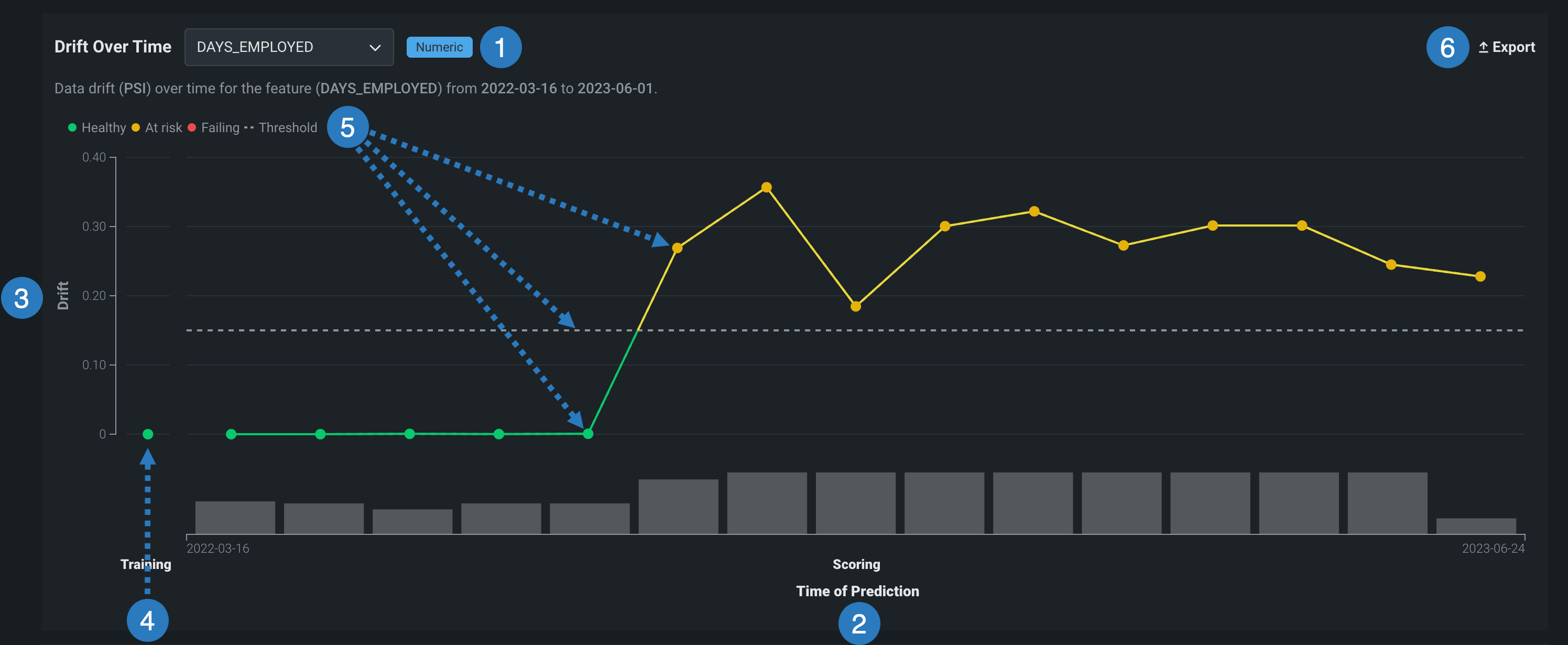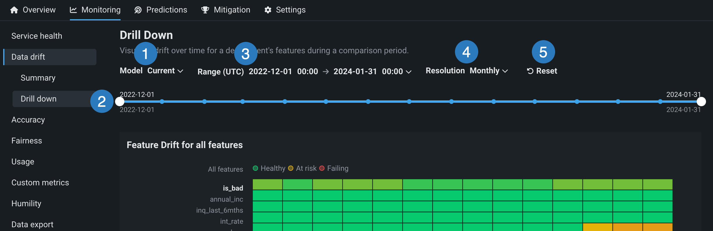 | 6 | Selected Feature | Sets the feature displayed on the Feature details chart and the Drift over time chart. |