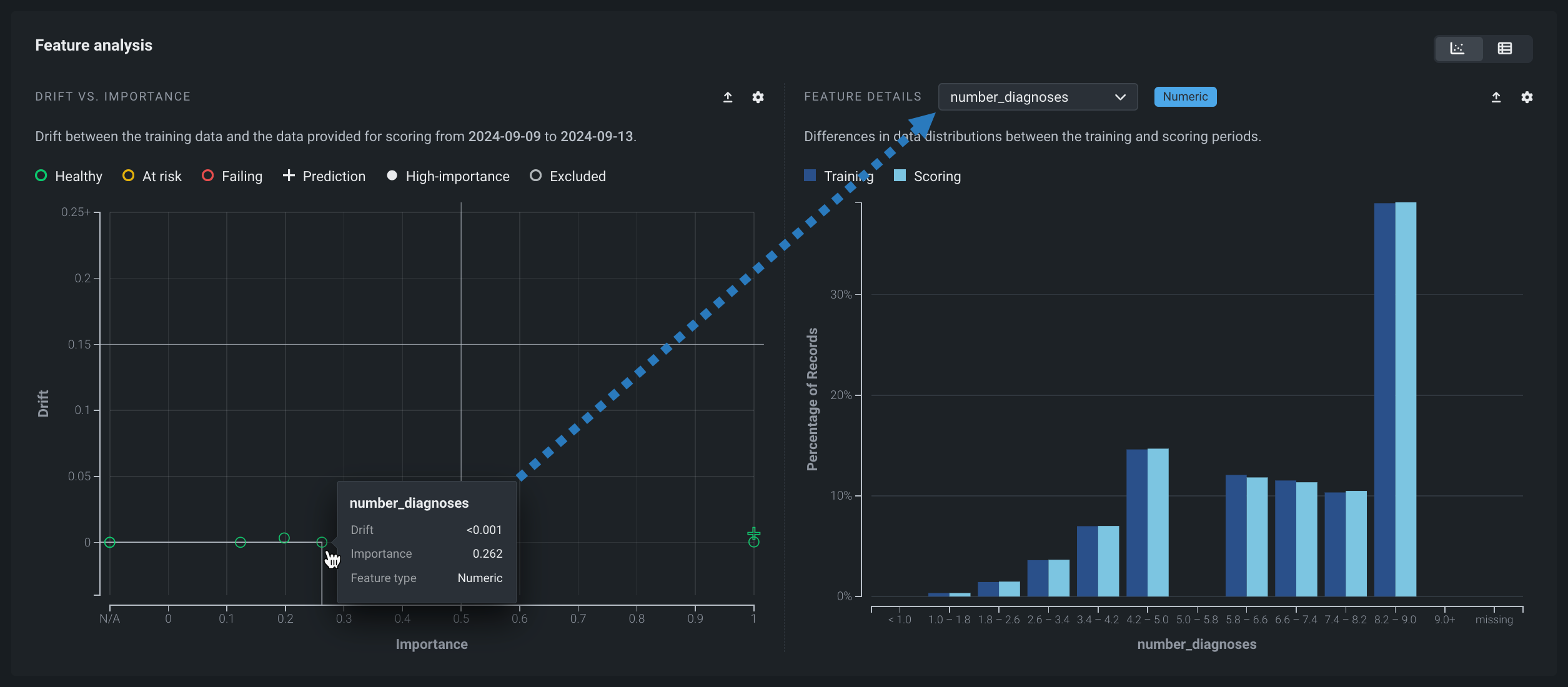 - : Displays the Drift vs. importance and Feature details charts, side by side.