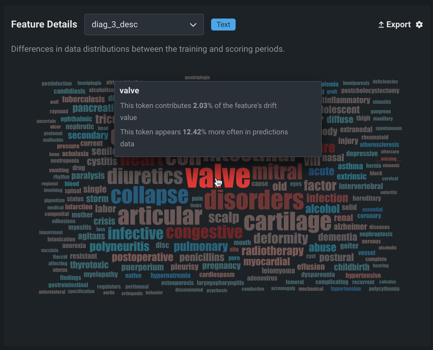 Text features are a high-cardinality problem, meaning the addition of new words does not have the impact of, for example, new levels found in categorical data. The method DataRobot uses to track drift in text features accounts for the fact that writing is subjective and cultural and may have spelling mistakes. In other words, to identify drift in text fields, it is more important to identify a shift in the whole language rather than in individual words.