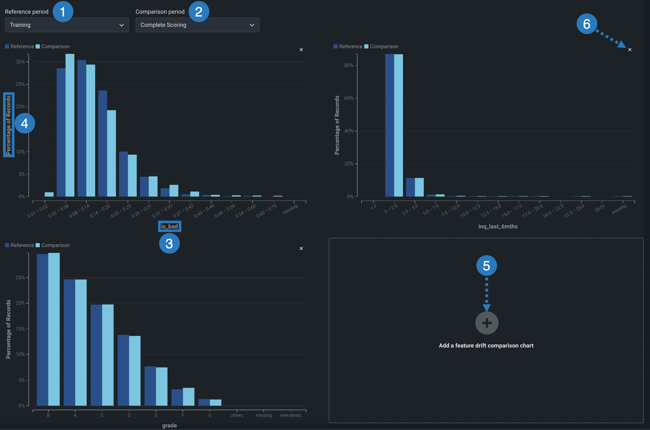 | 1 | Reference period | Sets the date range of the period to use as a baseline for the drift comparison charts. |