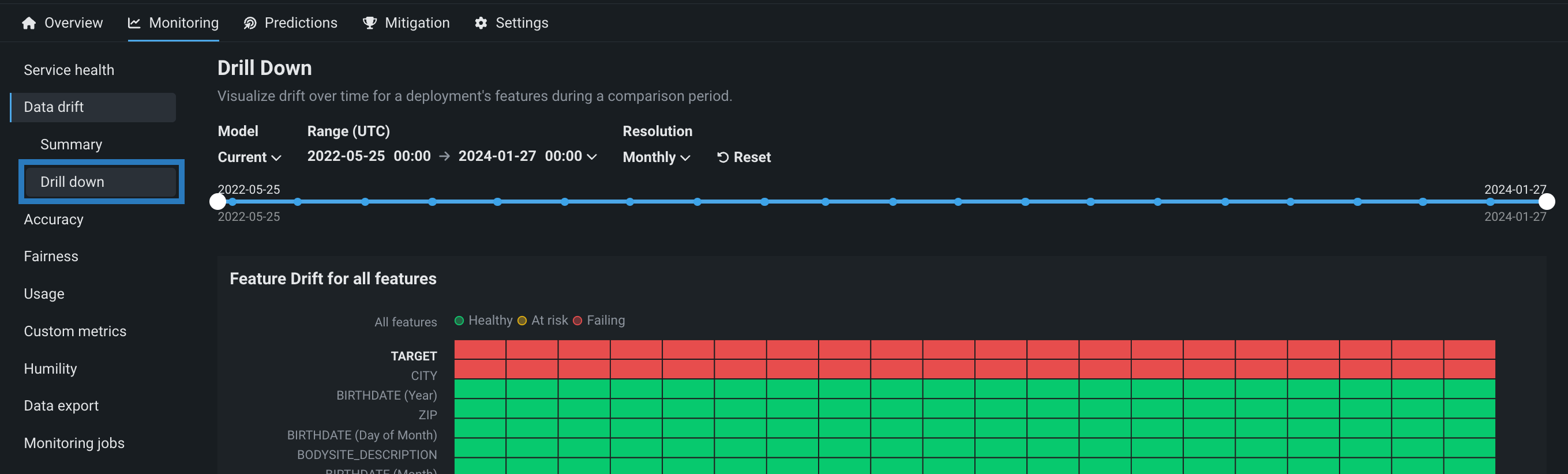 In addition to the visualizations above, you can identify drift trends using the Data drift > Drill down tab to compare data drift heat maps across features.