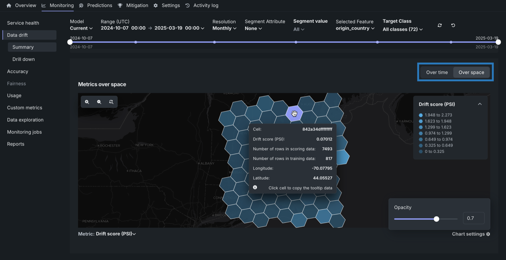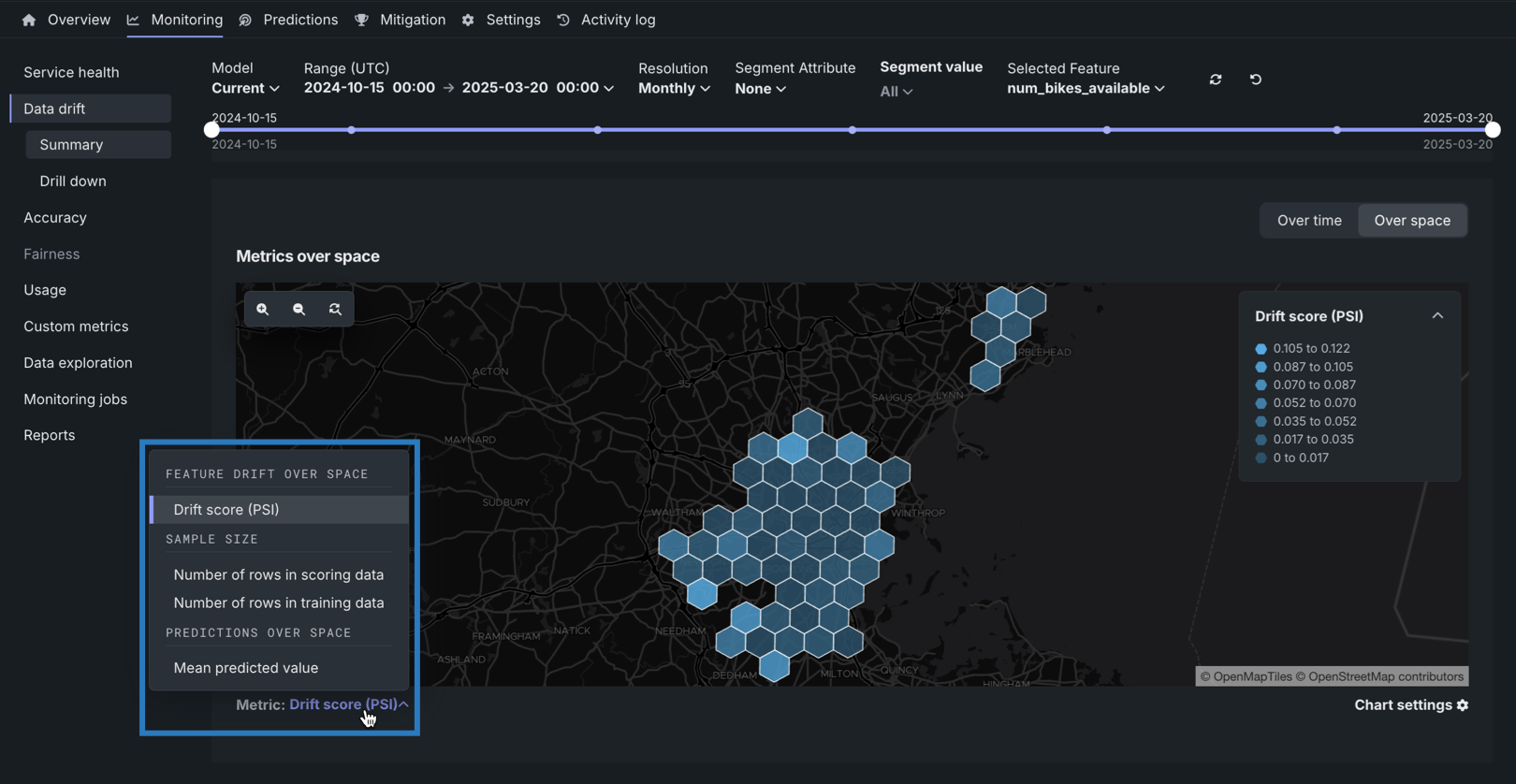 | Metrics over space chart | Illustrates the difference in distribution over space between the training dataset of the deployed model and the datasets used to generate predictions in production, tracking the change in the Population Stability Index (PSI)—a measure of data drift. In addition, for regression deployments, this chart tracks the mean predicted value. | Binary classification, multiclass, and regression (for location features) |