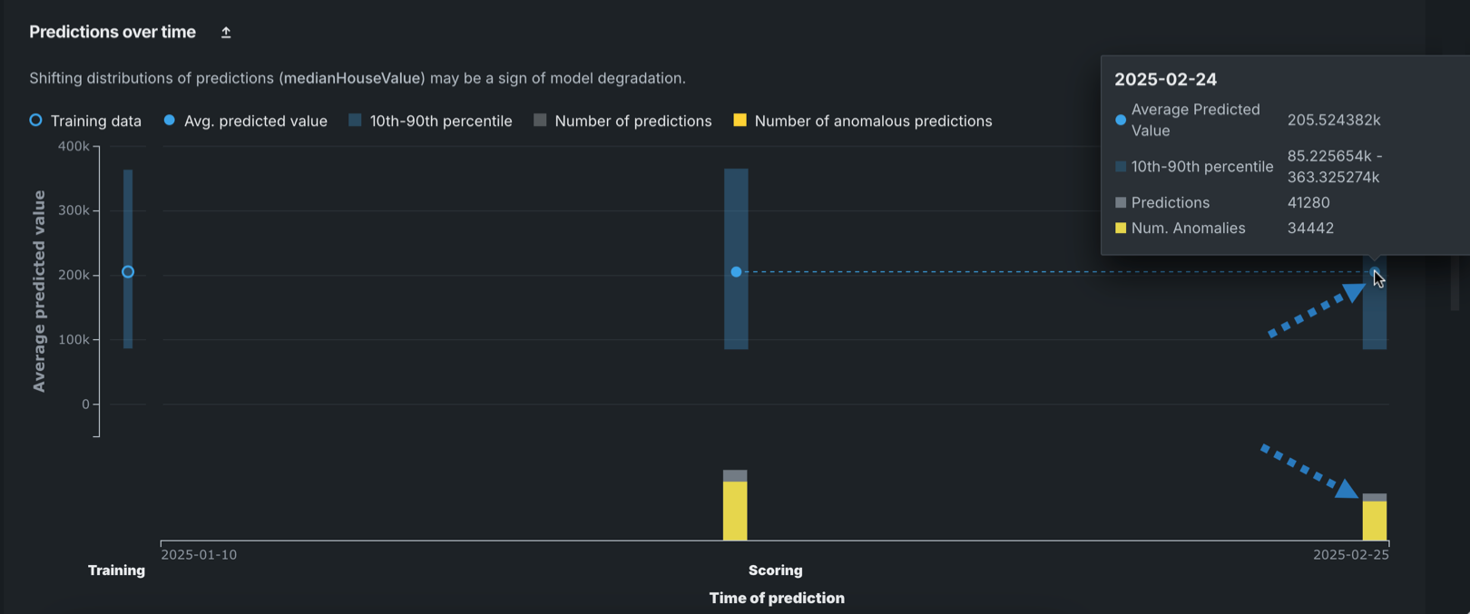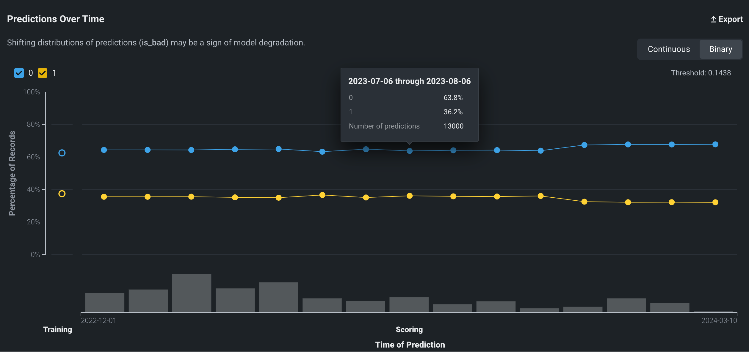 | 2 | Switch between continuous and binary modes in the predictions over time chart for a binary classification deployment. Hover over a point on the chart to view its details. |