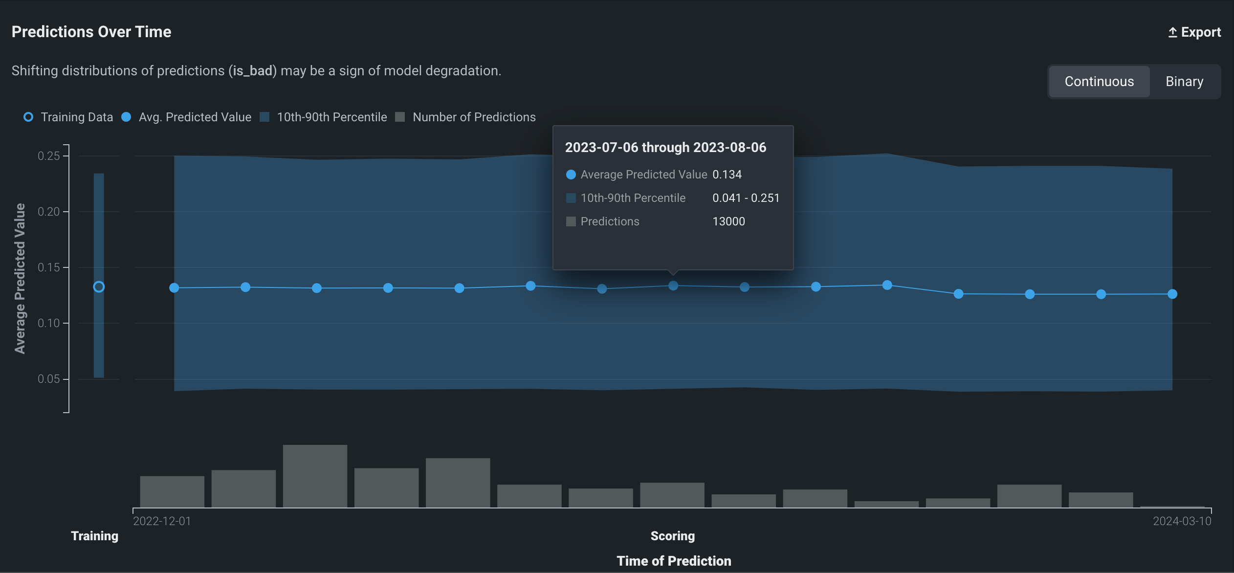 The Predictions over time can display data in Continuous mode and Binary mode: