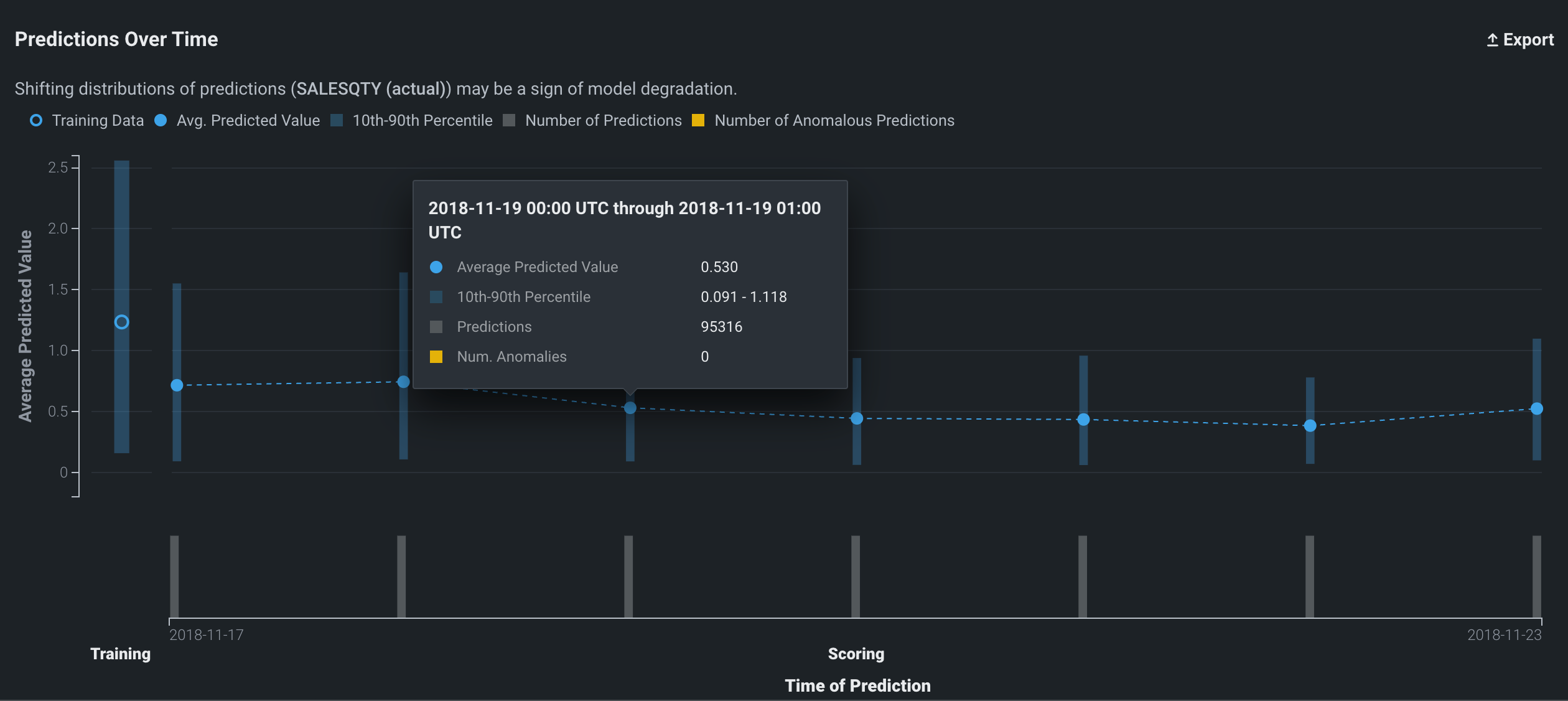 | 4 | Predictions over time | Illustrates how the distribution of a model's predictions has changed over time (target drift). The display differs depending on whether the project is regression, binary classification, or location. |