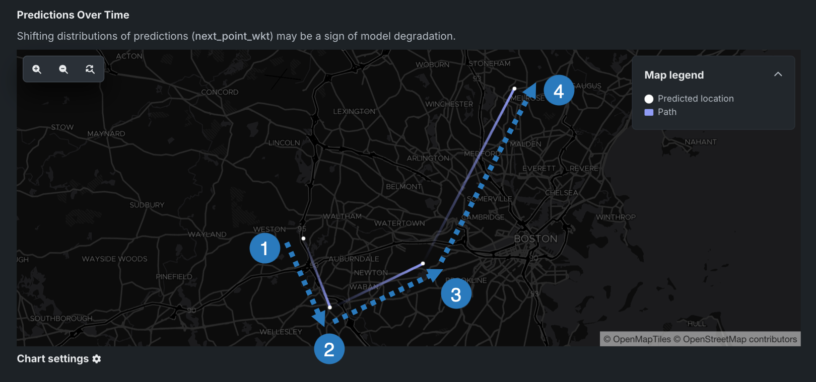 Each Path and Predicted location pair corresponds to a time range, where the path represents the directional change from one mean predicted location to another. For example, in the image below, you can trace the path from the location model's first mean predicted location, to its fourth.